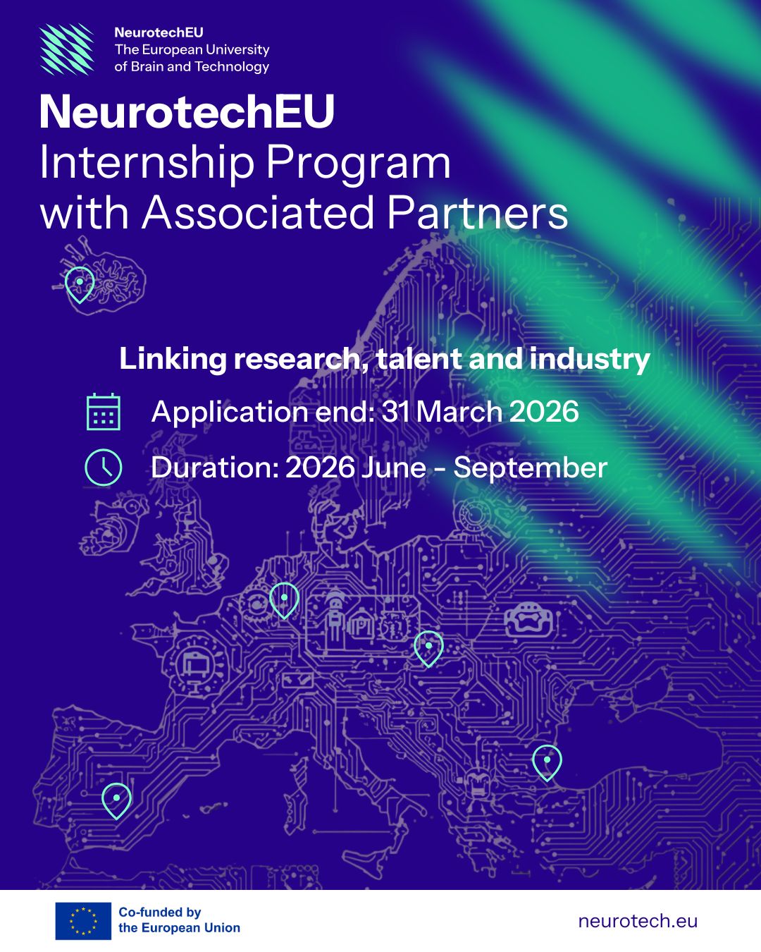 From June to September 2026, NeurotechEU's Associated Partners welcome more than 25 students from the NeurotechEU alliance for a hands-on, cross-sectoral experience in applied translational innovation in neurotechnology. This program creates new opportunities to connect research, talent, and industry across Europe.